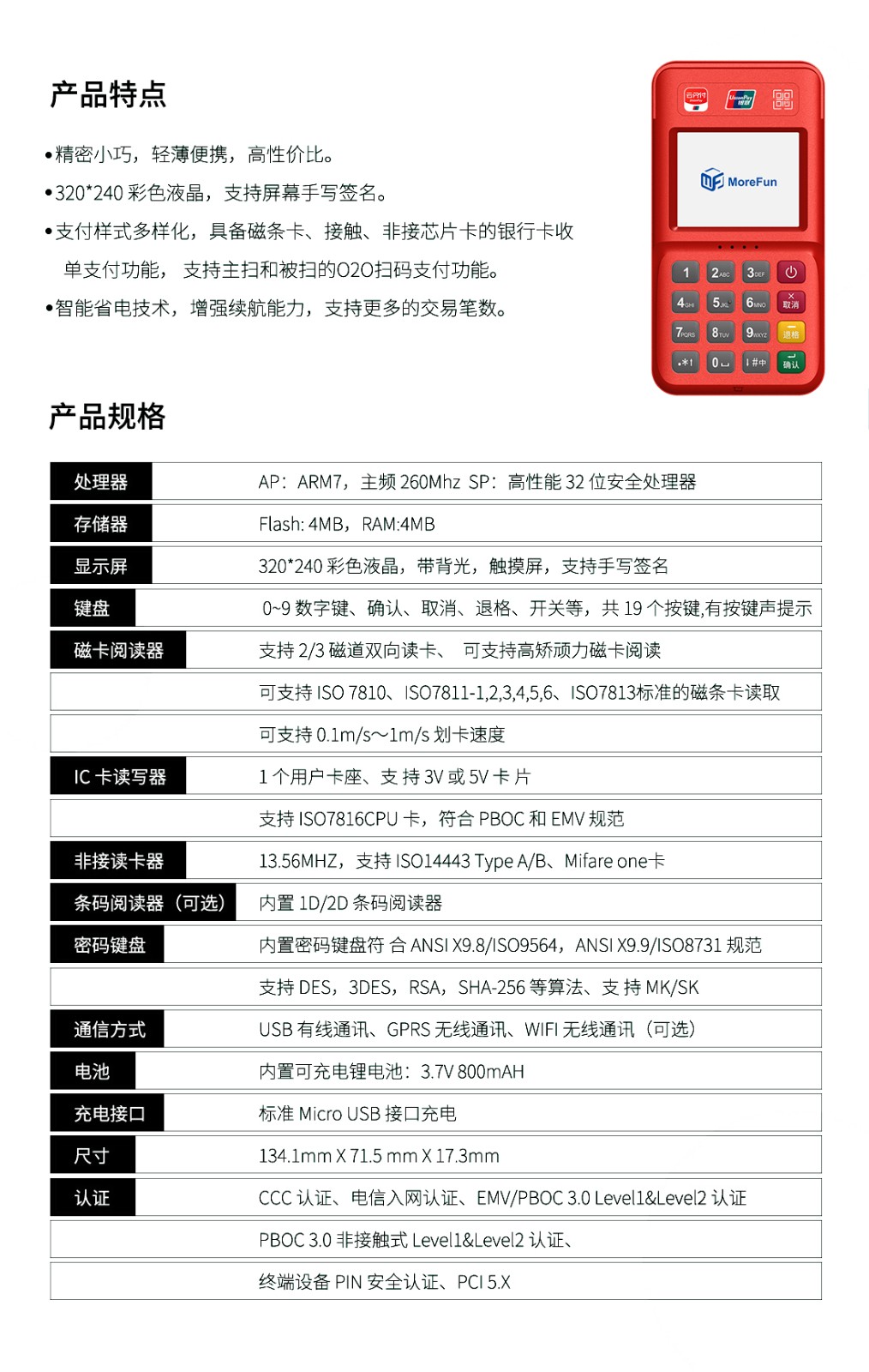 首页>>顺义产品中心>>顺义手持无线POS 顺义电银支付-4G+扫码枪 高配版 * 性能优越:32位高性能ARM11安全CPU;整机通过业内更先进的PCI PED4.X 安全认证及国内受理终端PIN输入设备安全评估检测认证,多项措施保障金融交易的安全;* 时尚外观:外形小巧携带方便,高抗跌落性能、宽工作温度、防水防尘设计、外壳坚固耐刮、户外携带式作业更加耐久可靠。* 通讯备份:支持2G-3G扩展;* 超长续航:3.7V-800毫安稳定续航能力,智能电池管理保证持续工作18小时,待机72小时。 标准配置 返 回
